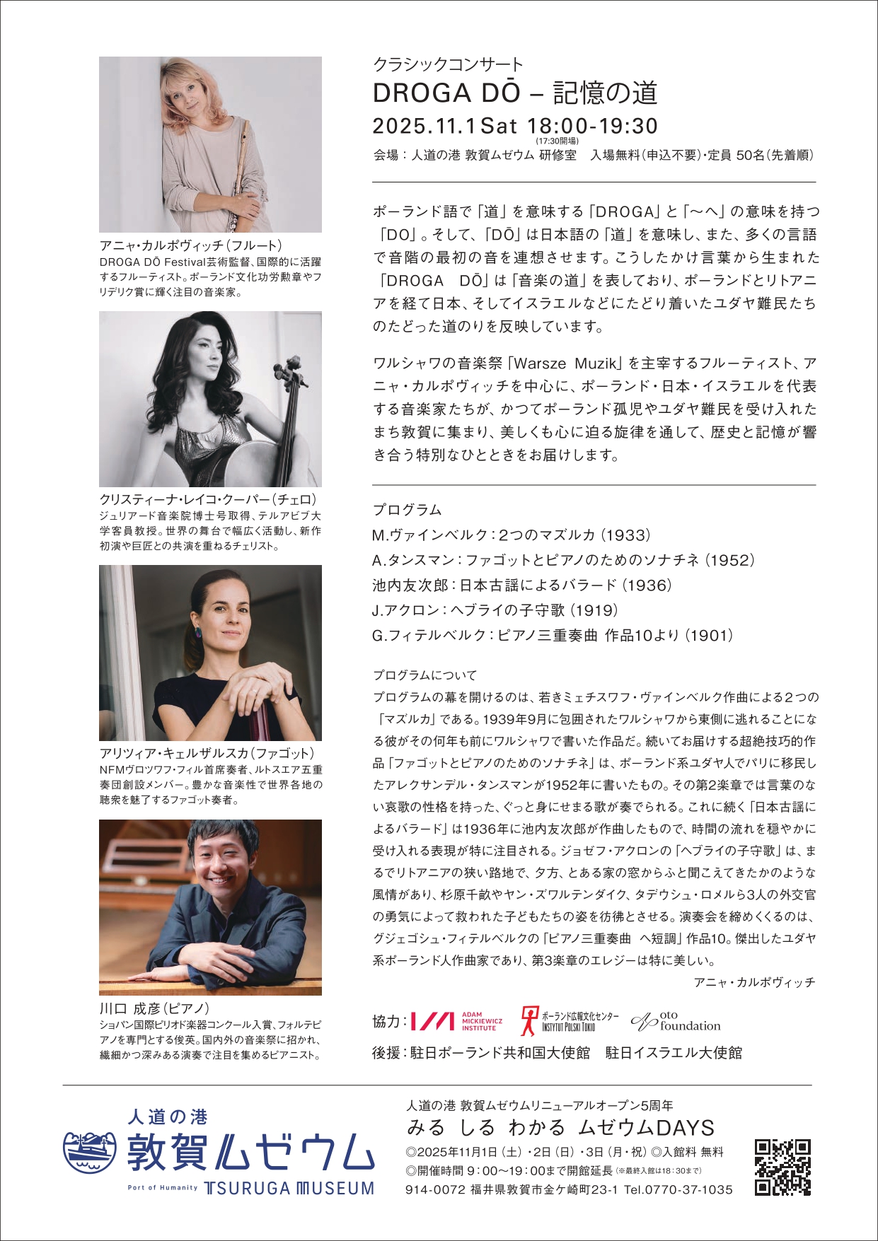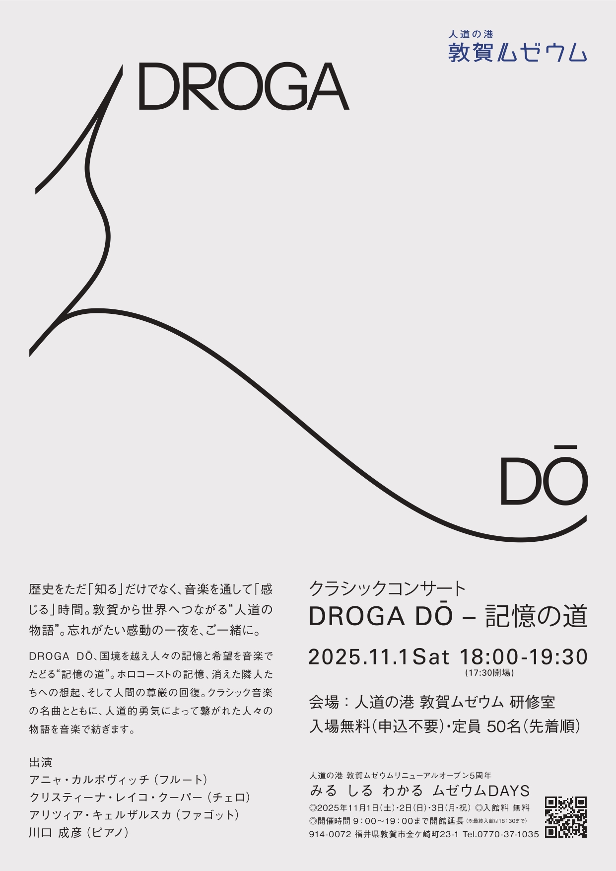 第二次世界大戦終戦から80年を迎える本年、命の大切さや平和の尊さを国内外に発信している 当館において、「人道」と呼ばれる史実やエピソードに 関連のある国々から音楽家を迎え、クラシックコンサートを開催します。歴史と記憶が響きあう特別なひとときをお楽しみいただき、音楽を通して平和の尊さについて思いを馳せていただければ幸いです。