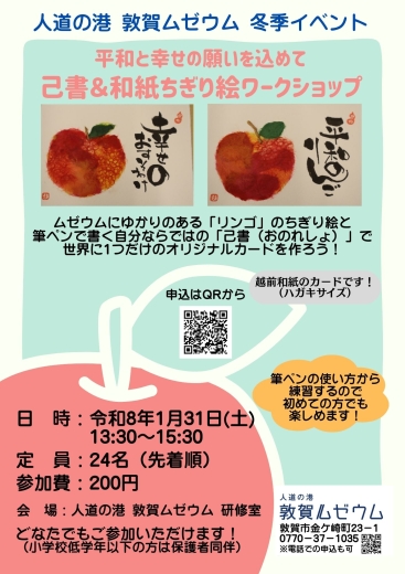 ユダヤ難民を敦賀の人々が温かく迎え入れたエピソードに登場するリンゴを越前和紙のちぎり絵で作り、筆ペンで自分ならではの文字を描く「己書」を添えて世界に1つだけのオリジナルカードを作るワークショップです。
